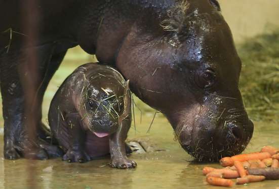 Una cría de hipopótamo pigmeo se sienta junto a su madre